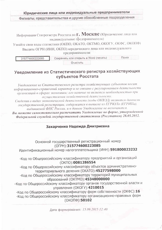 Индивидуальный предприниматель Захарченко Надежда Дмитриевна